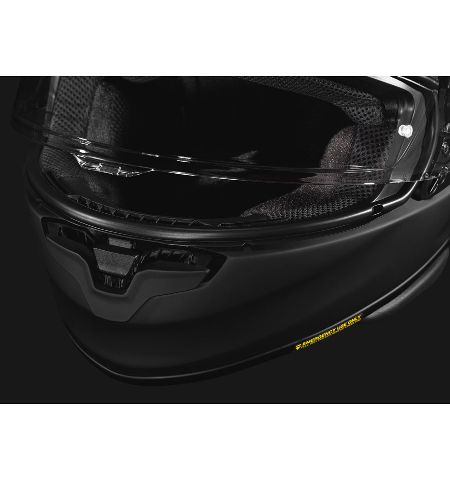 - E.Q.R.S. safety system: Emergency Quick Release System / simplifies helmet removal in an emergency