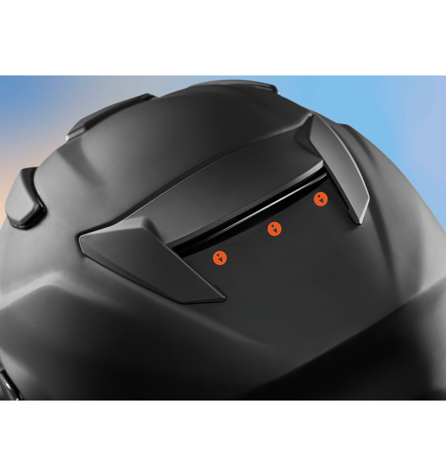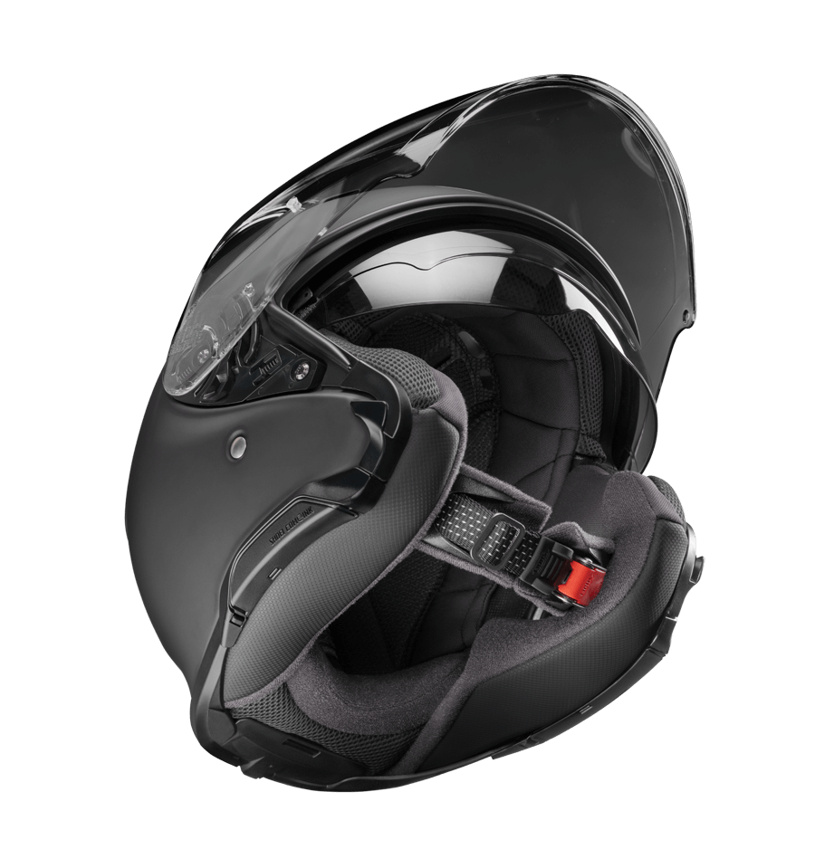 The spoiler edge on the bottom of the visor prevents the ingress of unpleasant wind draught and stabilises the visor against torsion. Locked in the stable, first position, the slightly open visor allows fresh air into the helmet to reduce fogging of the visor at slow speeds. An optionally available PINLOCK EVO visor effectively reduces the tendency of the visor to fog up in unfavourable weather conditions.