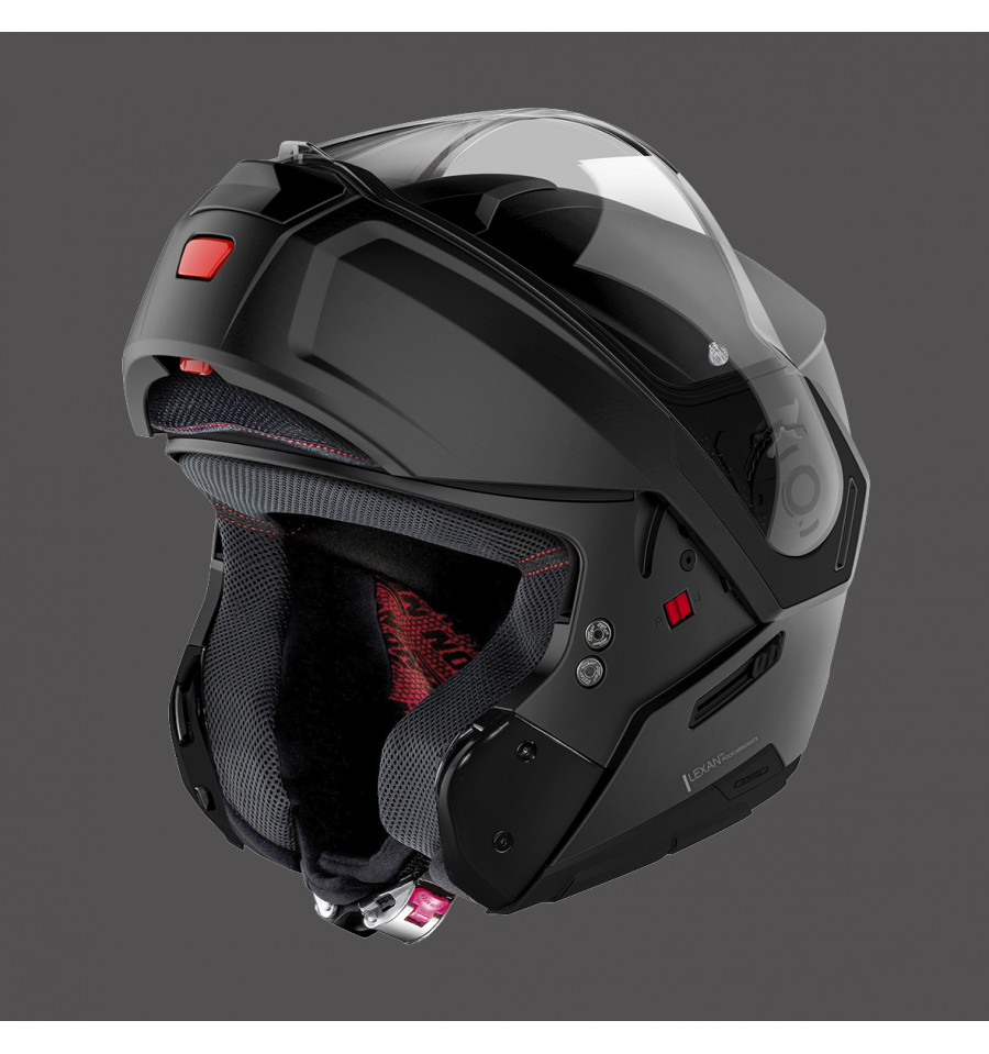 NOLAN N90-3 (V2) Classic, öppningsbar hjälm med en komfortabel gedigen och kompakt konstruktion, skal tillverkad av polykarbonat (Lexan) som är en transparent termoplast med exceptionell hållbarhet, den är stöt- och slagtålig. Polykarbonat marknadsförs under varumärken som Lexan, m.fl.