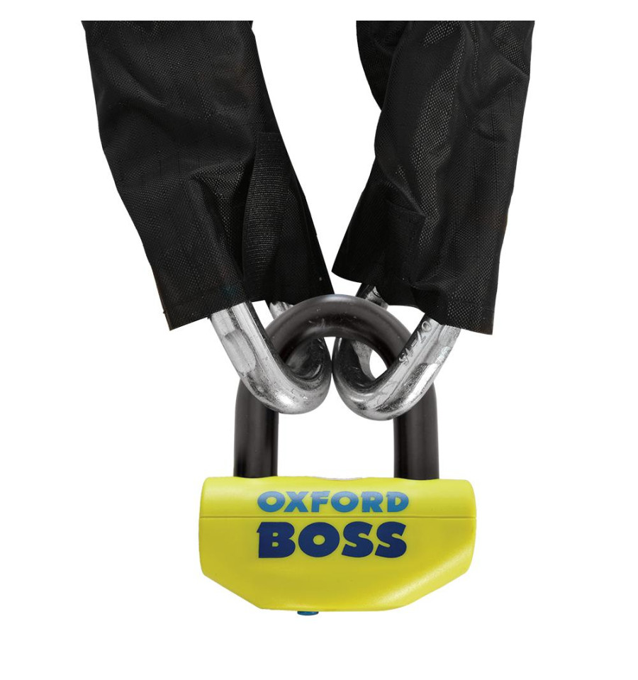 Oxford Boss 46 & Chain 200cm är utrustat med 12,7mm låsbygel och en 200cm lång fyrkants-kätting tillverkad av högkvalitativt Ni-Cro-Mo-legeringsstål. Kedjan har en skyddande tyghylsa för att förhindra skador och göra den lättare att hantera.