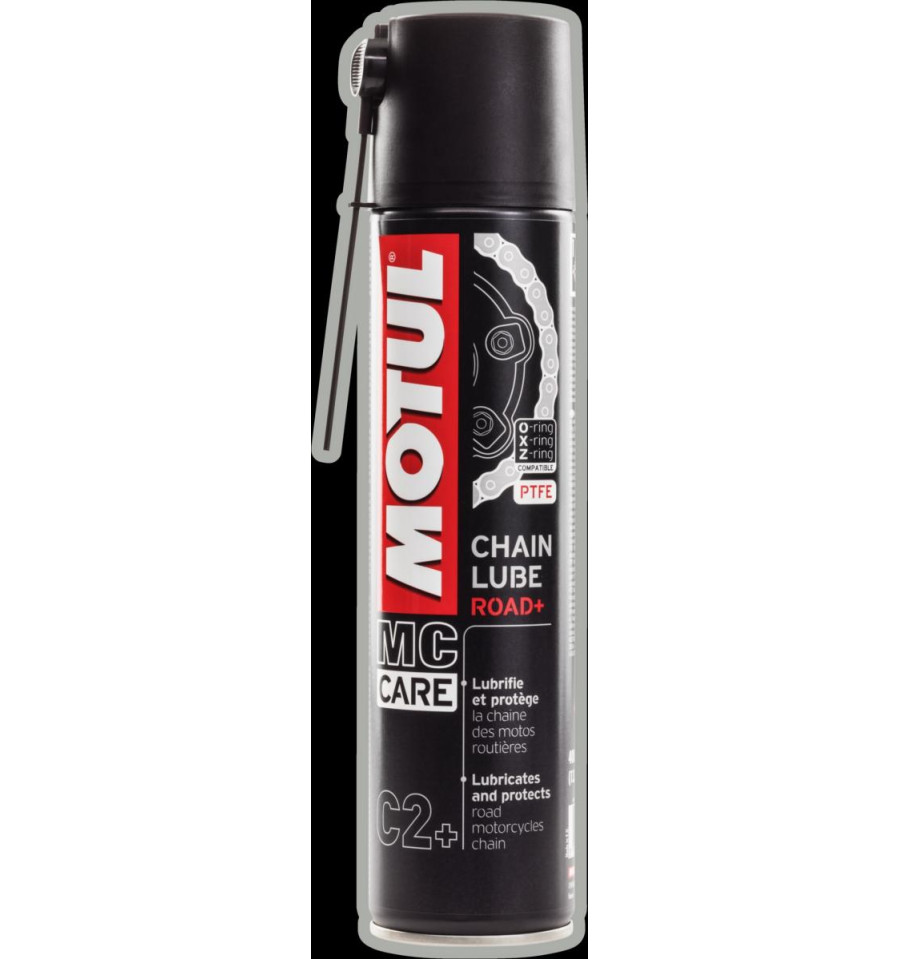 Motul Chainlube Road Plus (often C2+ or similar) is a high-performance, fully synthetic, white-colored lubricant designed for road motorcycle and go-kart chains, including O-ring, X-ring, and Z-ring types. The 100ml size is ideal for touring or carrying as a compact maintenance spray. It is formulated to resist high-speed fling-off, protect against corrosion, and reduce wear, with added PTFE for superior lubrication.