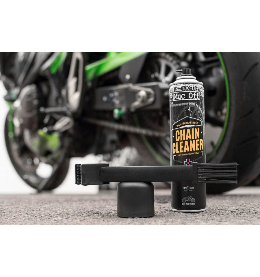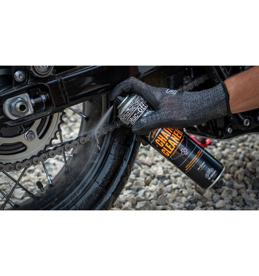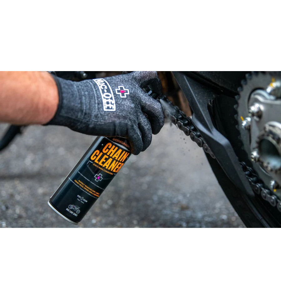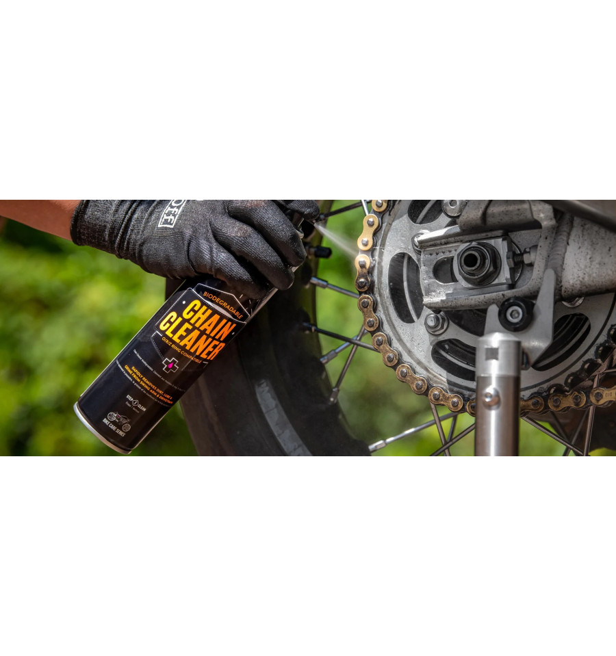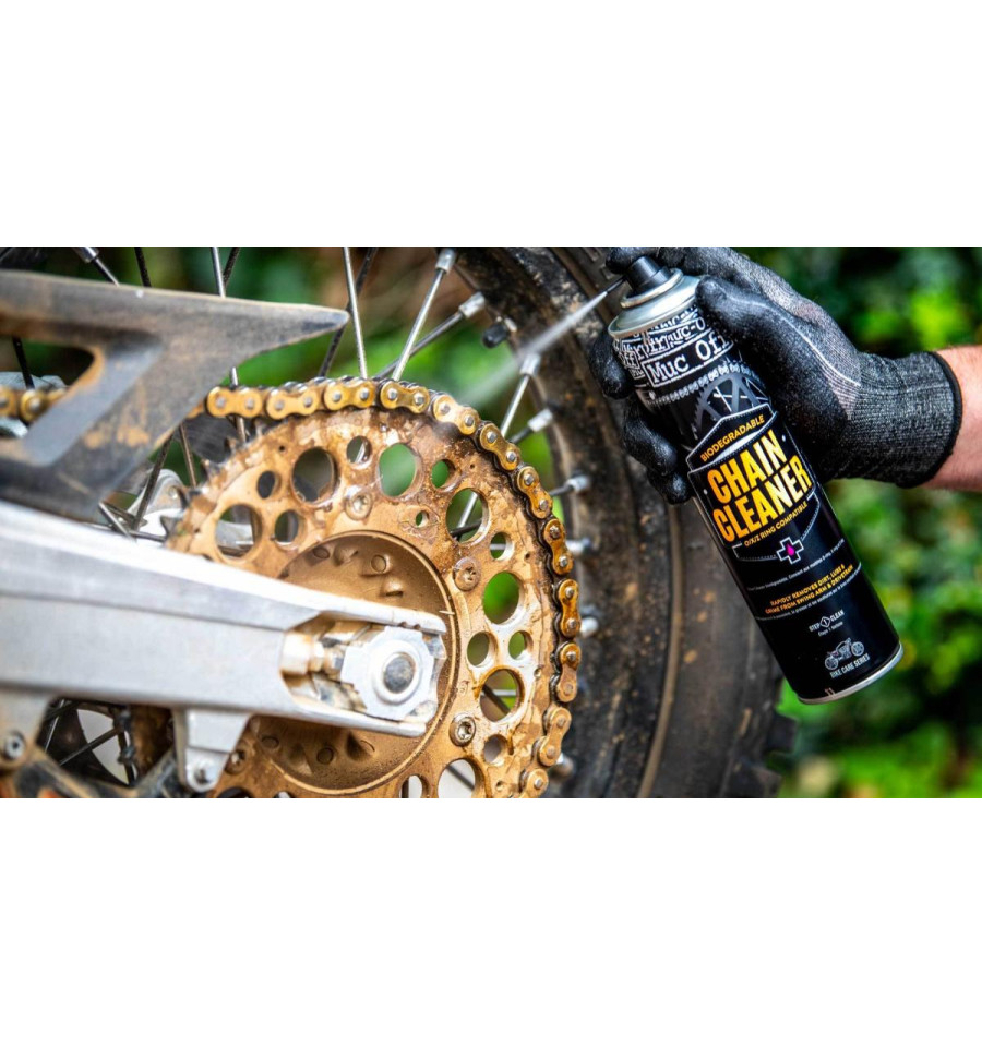 Muc-Off Motorcycle Chain Cleaner has been specifically formulated to quickly and safely remove dirt, lube and heavy chain grime using advanced solvents. Its unique biodegradable formula breaks down oil and grease to leave the entire chain sparkling clean and contaminant free.