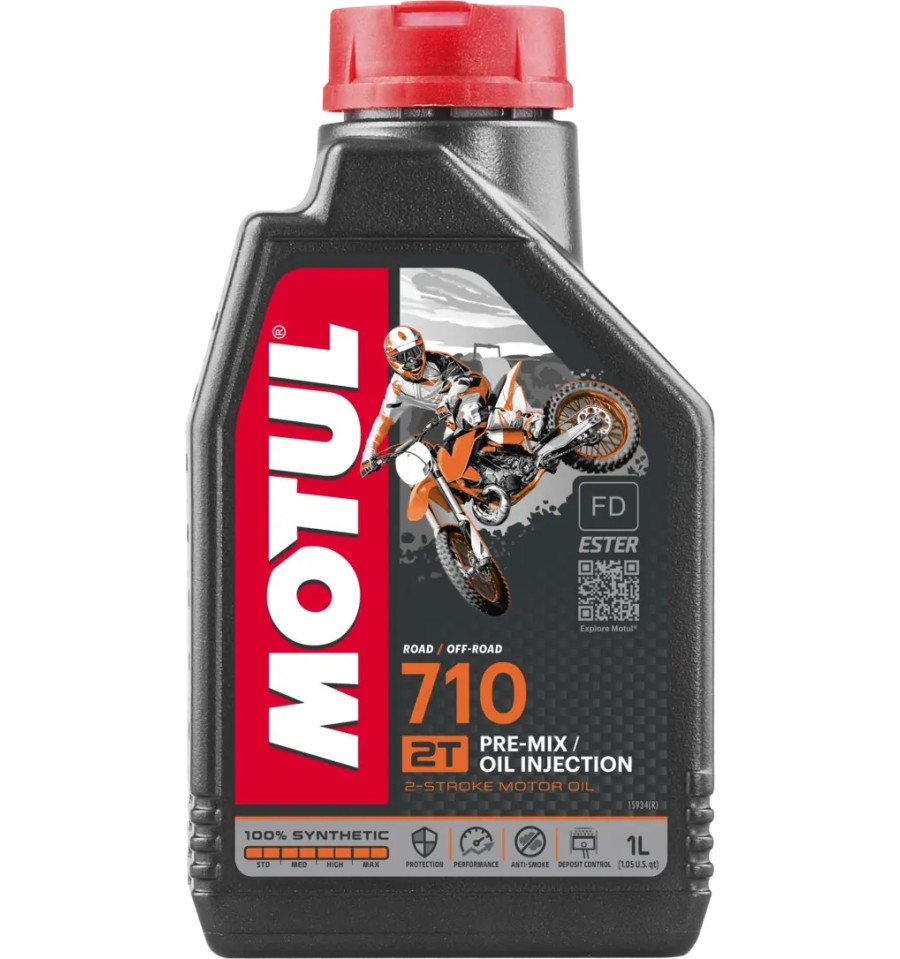 Motul 710 2T is a premium fully synthetic lubricant designed for all high-performance 2-stroke engines, including motorcycles and mopeds, race bikes, trail and off-road bikes, scooters and ATVs operating at high RPMs under severe conditions, whether equipped with an injection system or carburetors. This oil is suitable for premix or engines fitted with an oil pump and injector and can be used with all types of gasoline fuels – leaded or unleaded, with or without ethanol, and biofuels. It is fully compatible with catalytic converters.